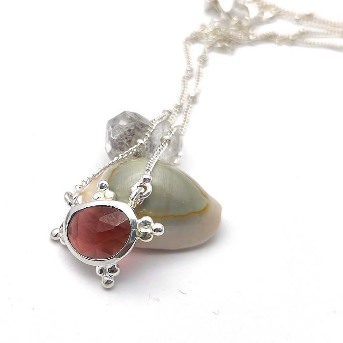 This beautiful necklace is made from fine quality natural Garnet gemstone, and was hand carved in an oval uneven shape with faceted cuts and finished using Sterling Silver. Stone size is approx 12x9mm.