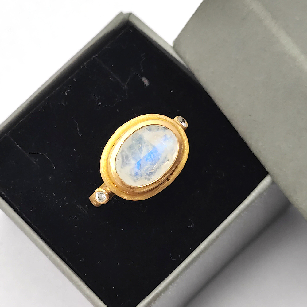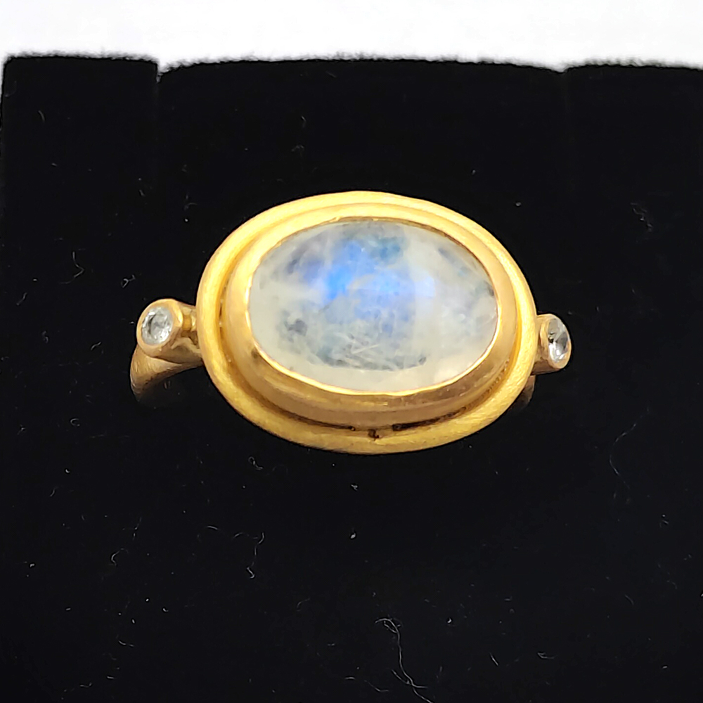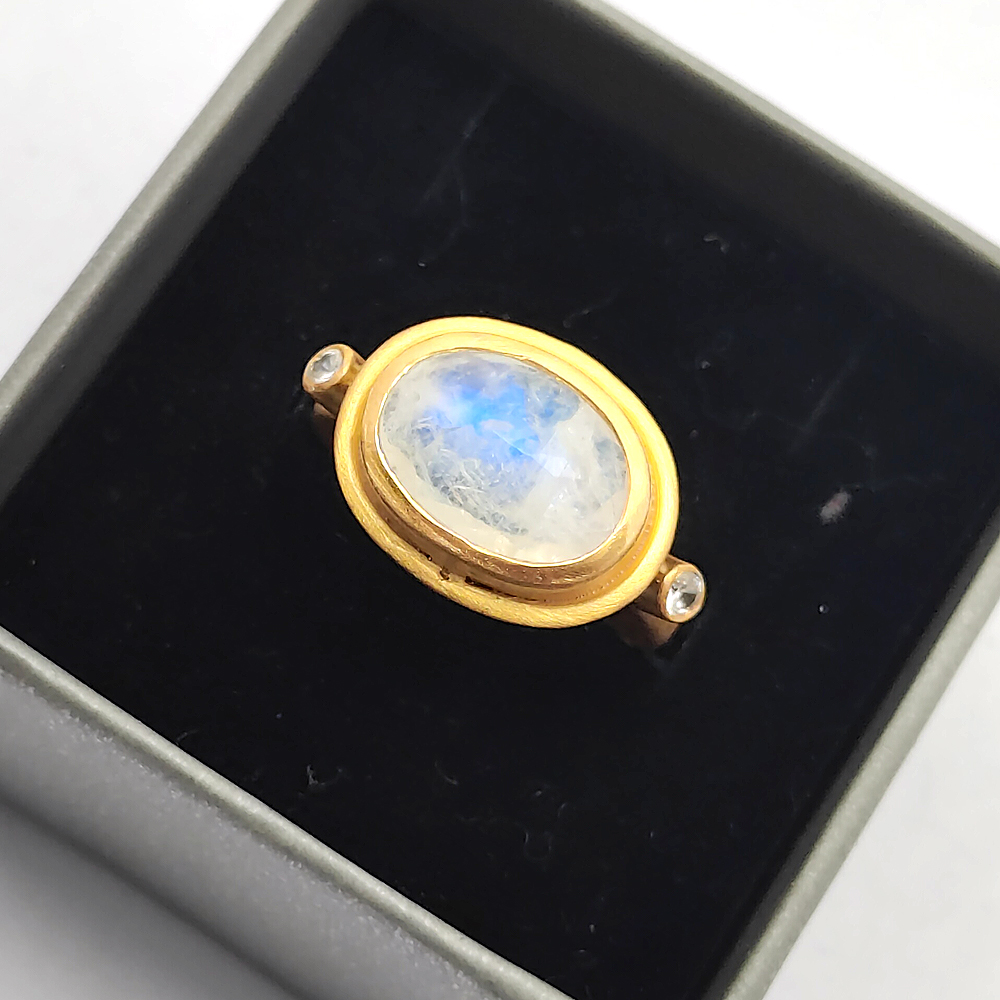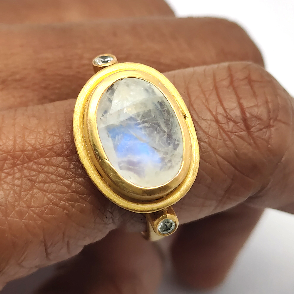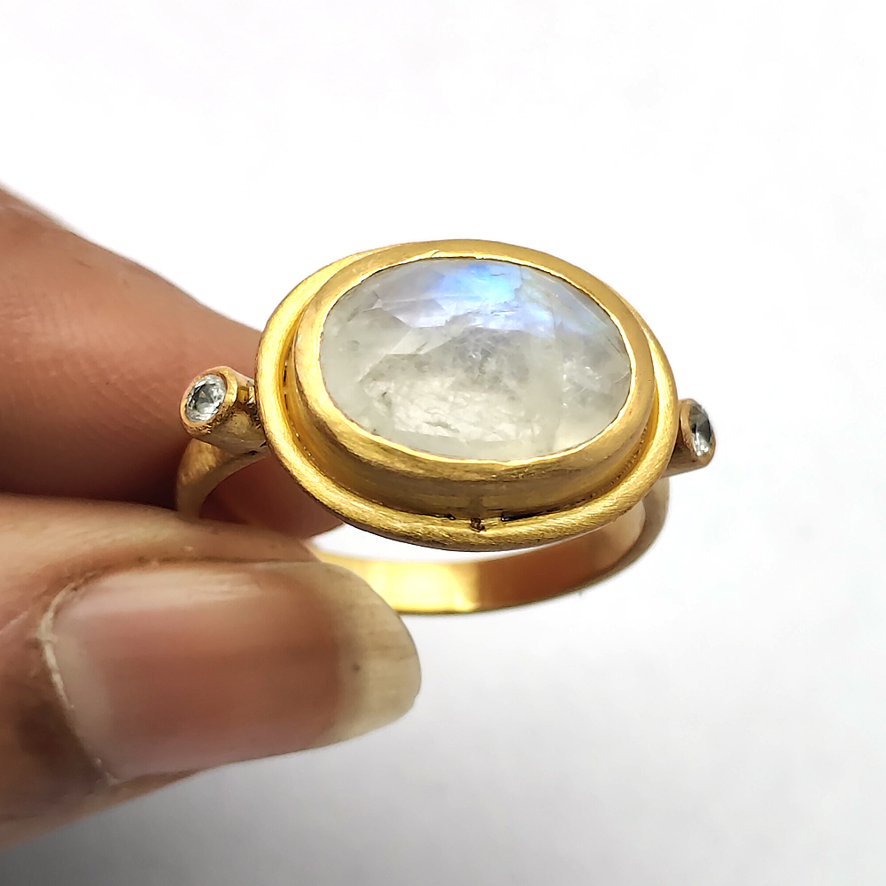 Ethnic style Handmade Natural Rainbow moonstone oval cut 925 Sterling silver matt finish permanent gold plated Ring 6.38 Gms Size US 10 Cz set Rings