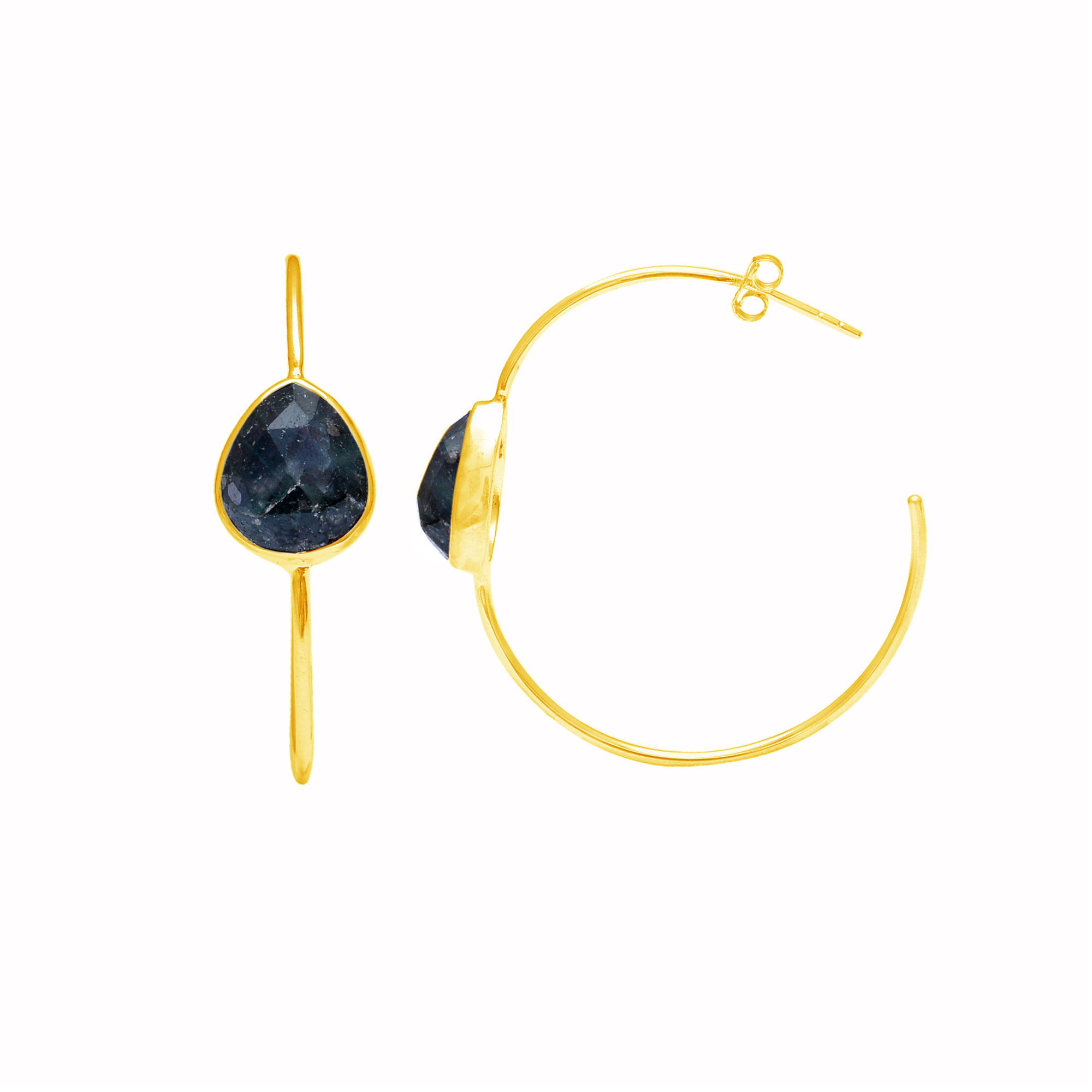 These stunning hoop earrings are stylishly simple enhanced with pear rose cut gemstones. Made of sterling silver, with stud post fastening, these earrings are light and comfortable to wear.