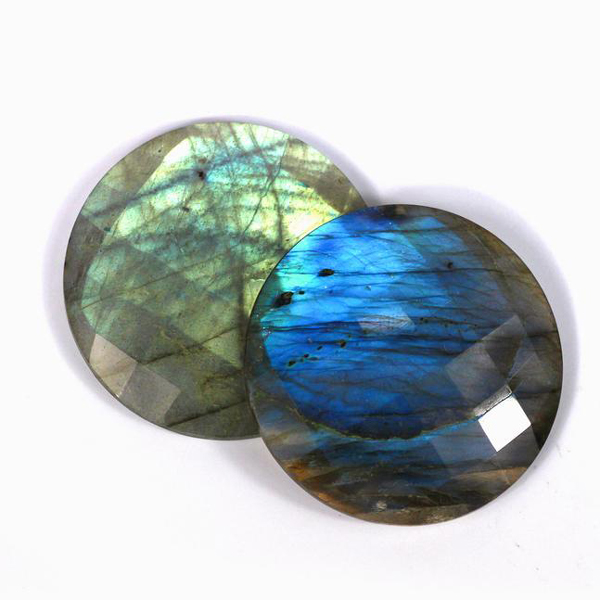 Labradorite 40mm round checkerboard cut flat cab 81.0 cts