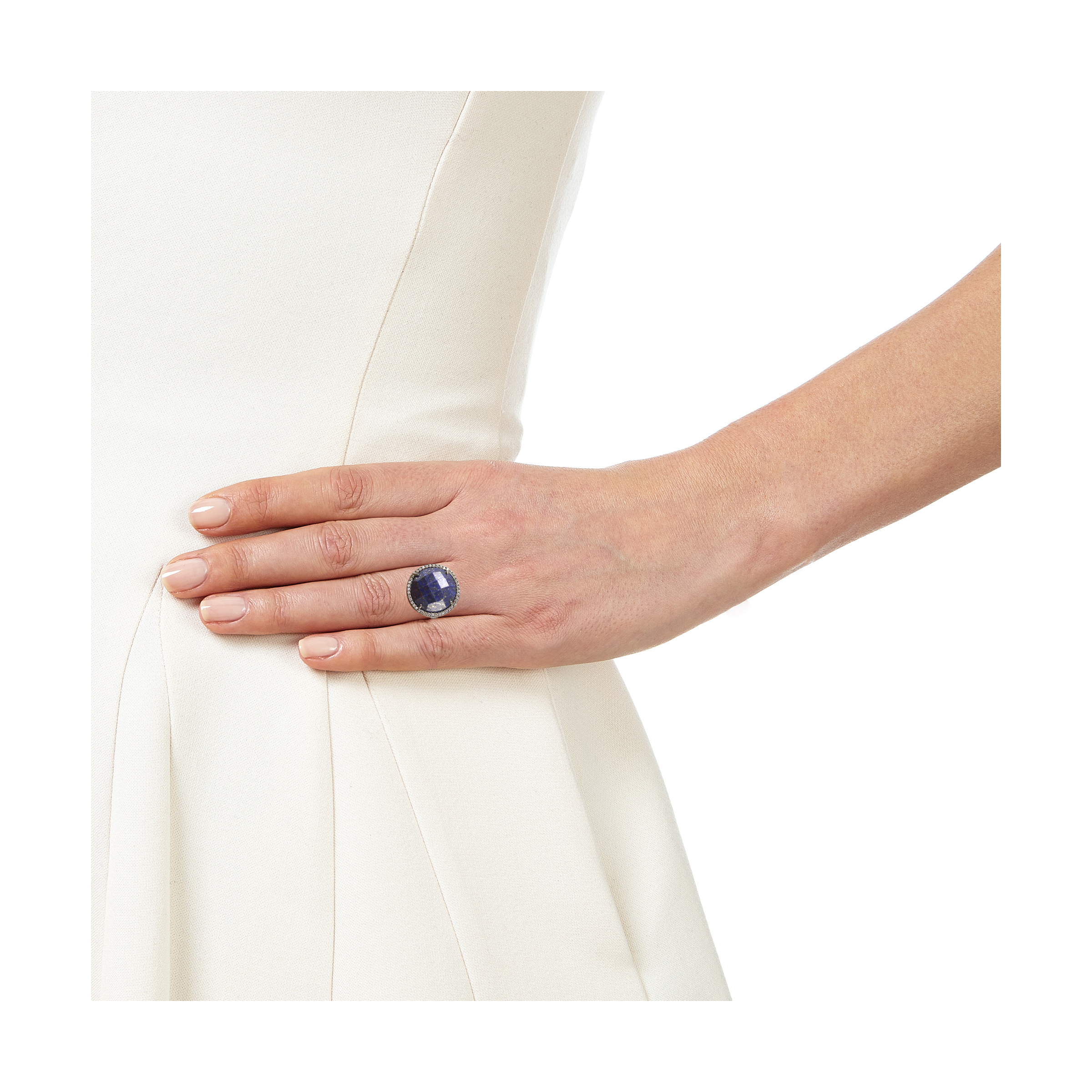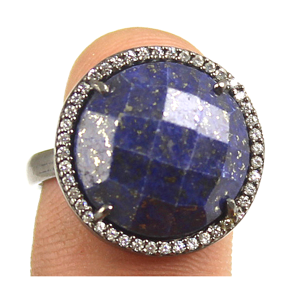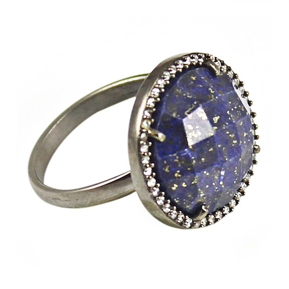 This beautiful cocktail ring features gorgeous faceted lapis lazuli set in black rhuthenium or rhodium. There is a row of sparkling faceted white cz gemstones pave set on the band near the blue lapis Stone. The setting is in sterling silver with gold plating/black rhodium plating. The smooth band and elegant prongs make this great for just about any occasion from everyday wear to going out