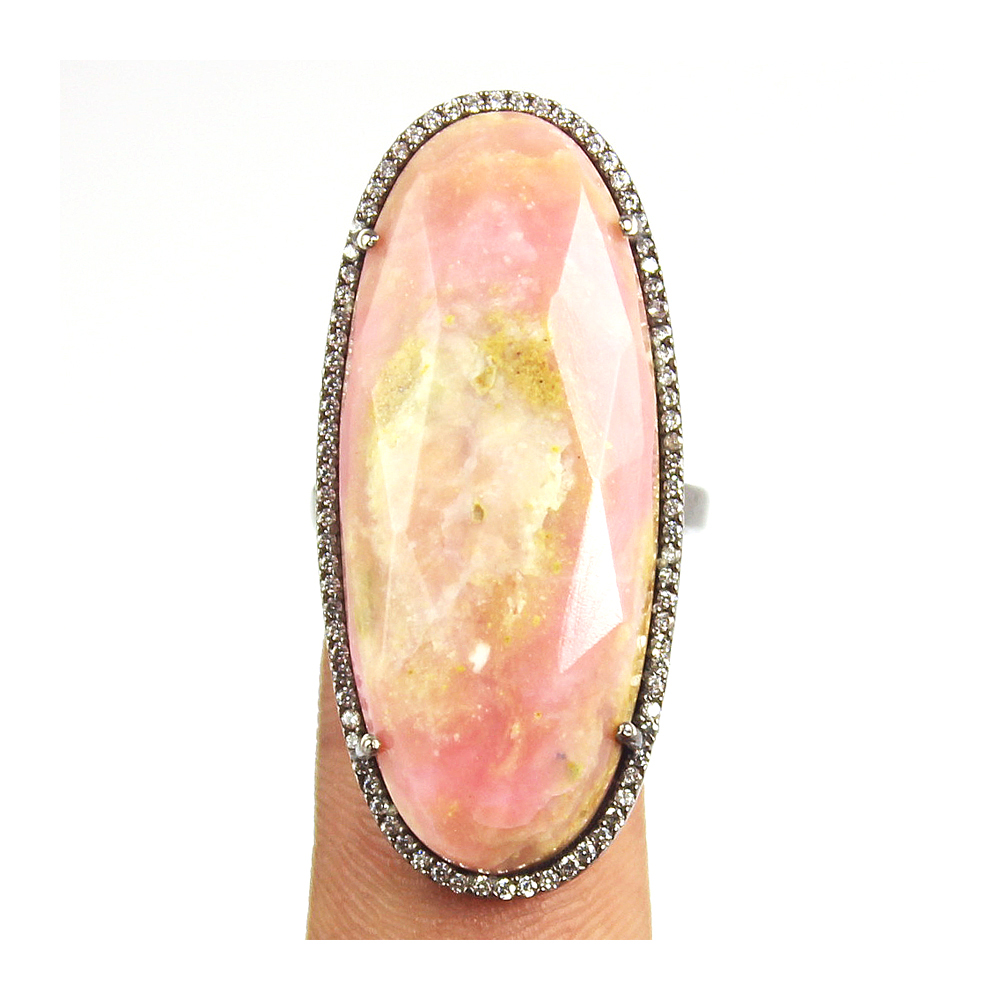This cocktail ring is sure to dazzle. A large, oval, faceted center Rhodocrosite stone surrounded by White cz pave.