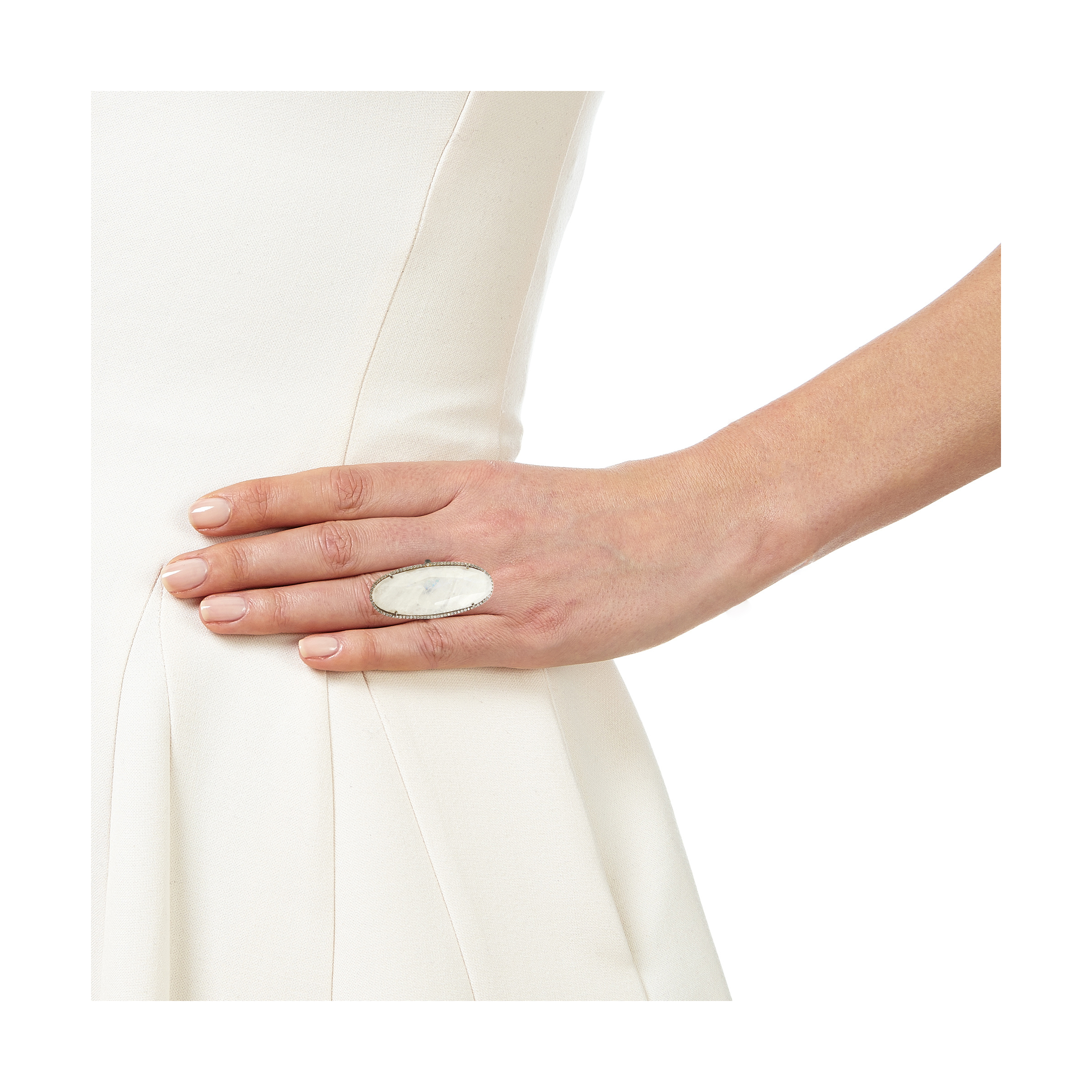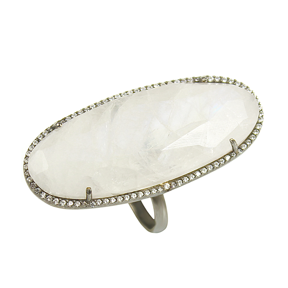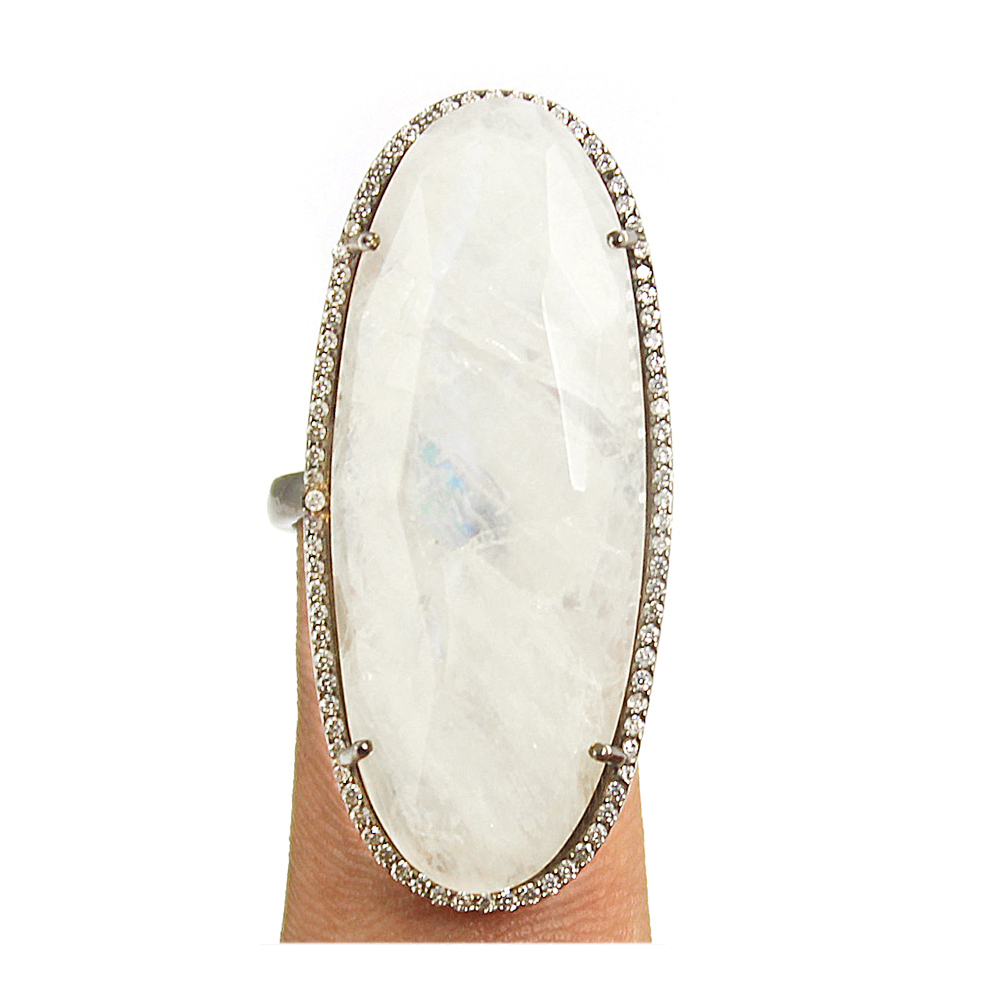 This cocktail ring is sure to dazzle. A large, oval, faceted center Rainbow moonstone stone surrounded by White cz pave.