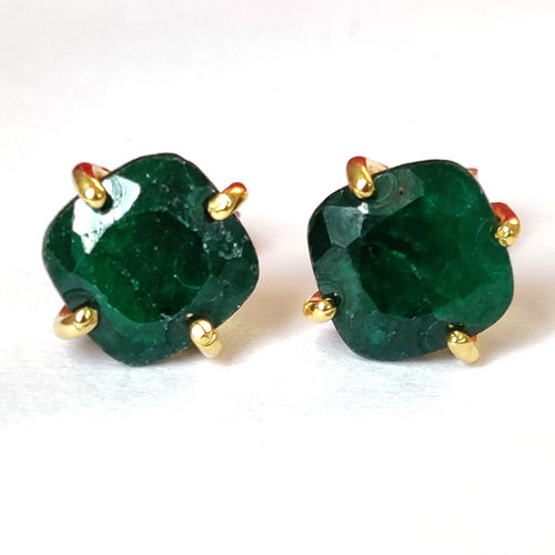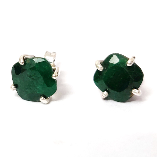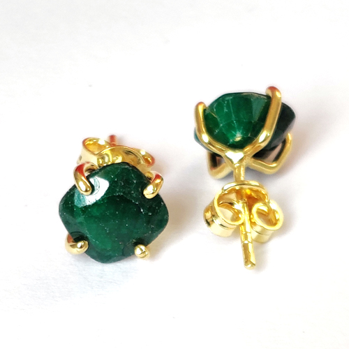 Add a glam of fashion with color to your style with these raw emerald silver May birthstone stud earring. This earring features a four prong setting, that holds an approx 8MM cushion cut stone for a personal glam of color. It has a total grams weight of 5.0 gms and has four type of plating options over silver. Plating is to help protect it from scratches. It's a great gift for friends with May birthdays!