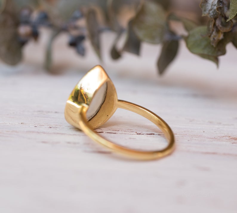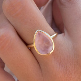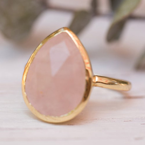 Plain simple delicate pear shape rose quartz ring. You can choose plating as 4 options are available. You can buy just sterling silver in shiny white silver color, Gold plated over silver for yellow gold tone or rose gold plating over silver for red copper look. Most of all popular sizes are available. If you need any special sizes, please let me know by email or my whatsapp 0091-9929435029