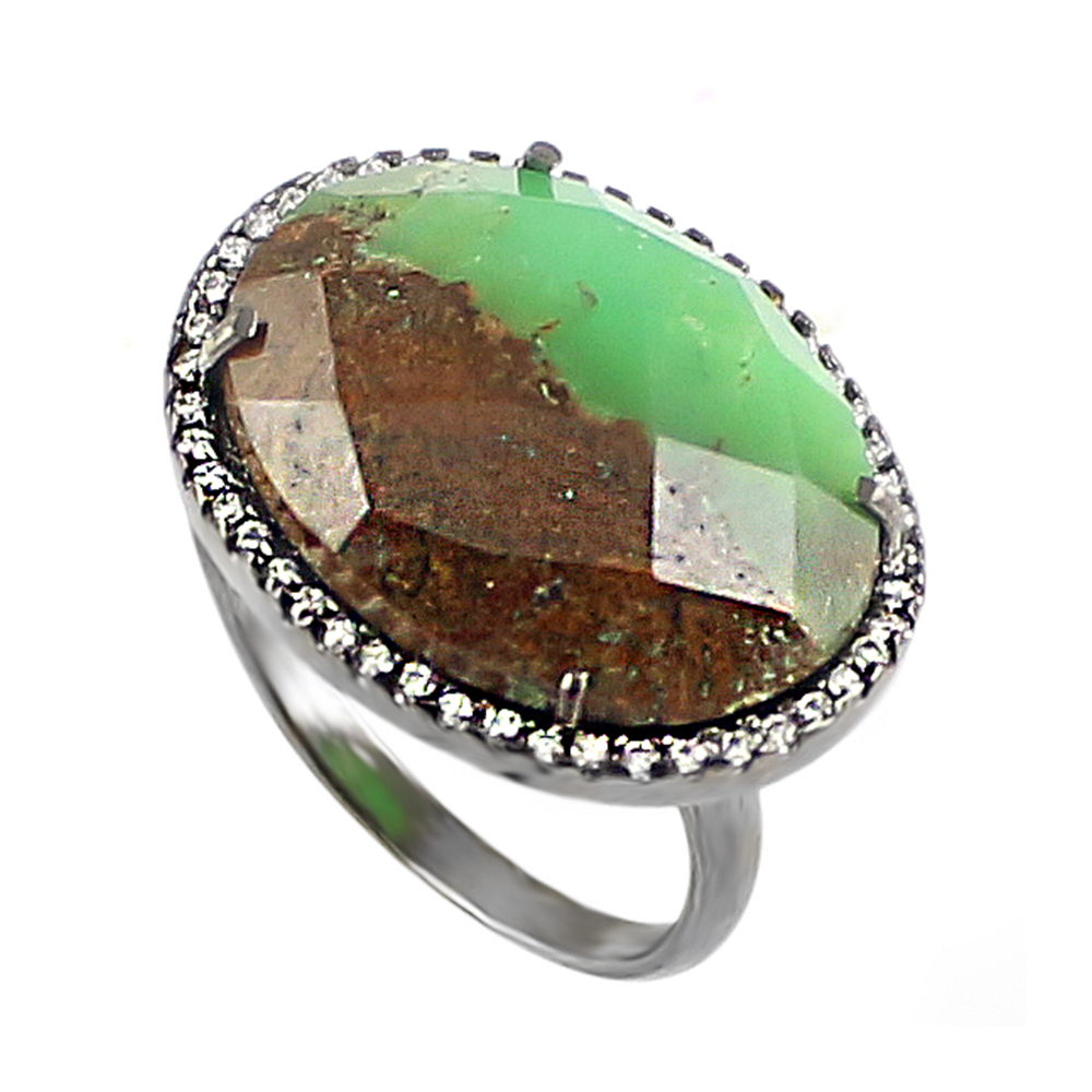 This Vintage chrysoprase Cocktail style is created Genuine black Rhodium Plated, 20x15 mm Oval Cut chrysoprase raw Center Stone and Garnished with Round Cut Clear Cubic Zirconia Polished into a Lustrous Silver tone Finish. Make a statement with this chrysoprase Cocktail Ring for your weekend outing and special event.