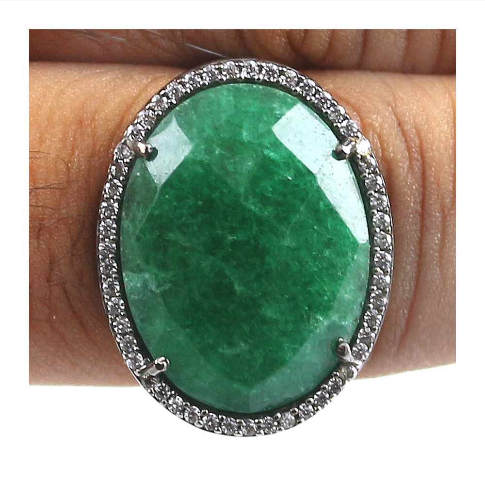 This Vintage emerald Cocktail style is created Genuine black Rhodium Plated,  20x15 mm Oval Cut emerald raw Center Stone and Garnished with Round Cut Clear Cubic Zirconia Polished into a Lustrous Silver tone Finish. Make a statement with this emerald Cocktail Ring for your weekend outing and special event.