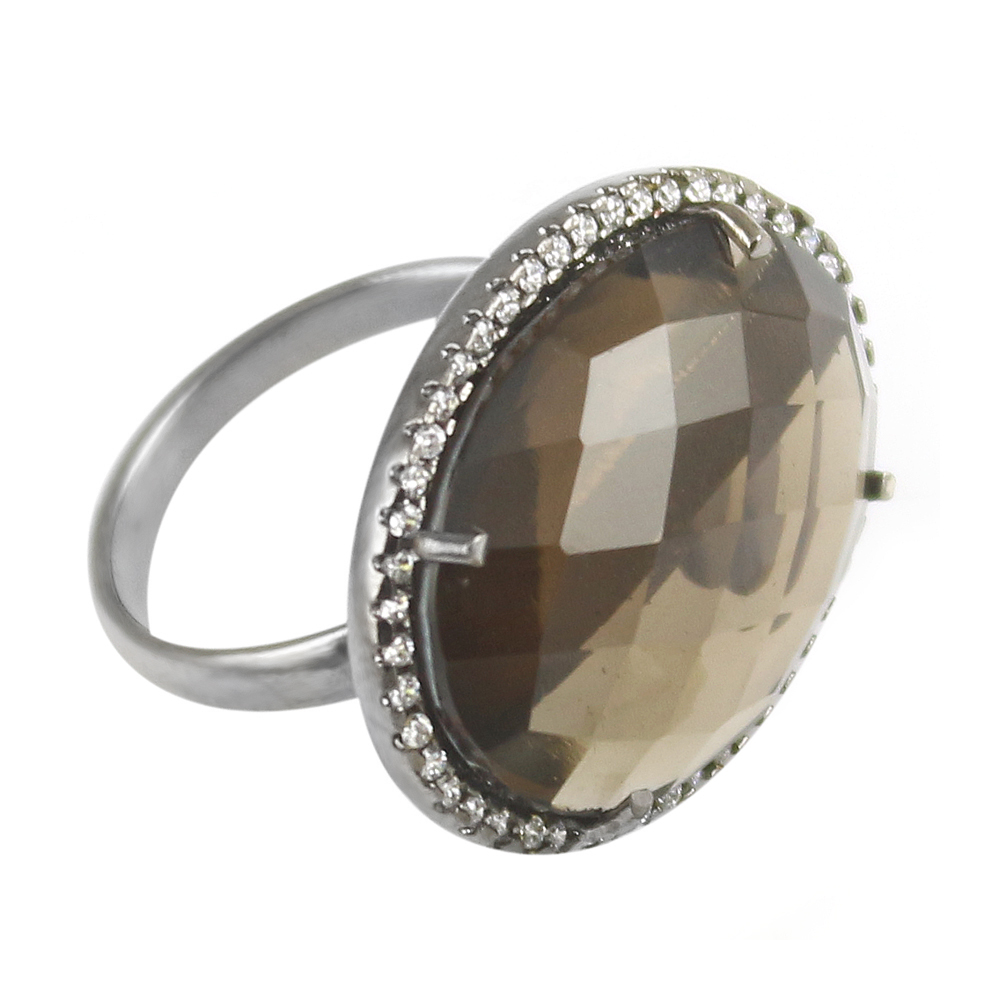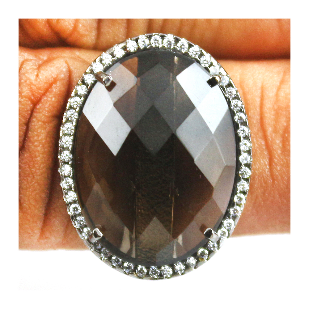 This Vintage smoky topaz Cocktail style is created Genuine black Rhodium Plated,  20x15 mm Oval Cut smoky topaz Center Stone and Garnished with Round Cut Clear Cubic Zirconia Polished into a Lustrous Silver tone Finish. Make a statement with this smoky topaz Cocktail Ring for your weekend outing and special event.